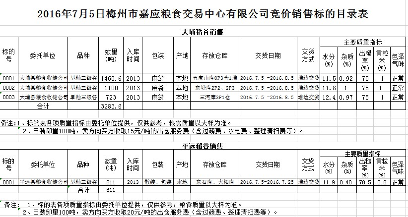 受客戶(hù)委托,梅州市嘉應(yīng)糧食交易中心有限公司定于2016年7月5日舉辦糧食競(jìng)價(jià)交易會(huì),大埔縣糧食收儲(chǔ)公司擬銷(xiāo)售2013年早秈稻谷3283.6噸,平遠(yuǎn)縣糧食收儲(chǔ)公司擬銷(xiāo)售2013年早秈稻谷611噸。