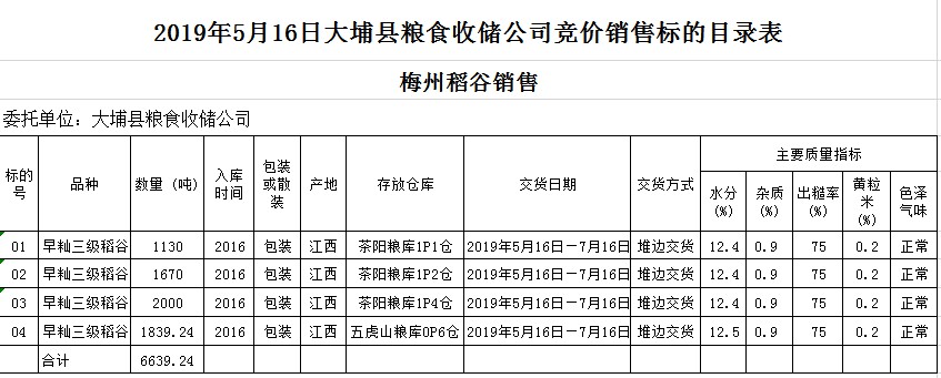 受客戶委托,梅州市嘉應(yīng)糧食交易中心有限公司定于2019年5月16日(星期四)舉辦糧食競價交易會,大埔縣糧食收儲公司擬銷售2016年早秈稻6639.24噸。