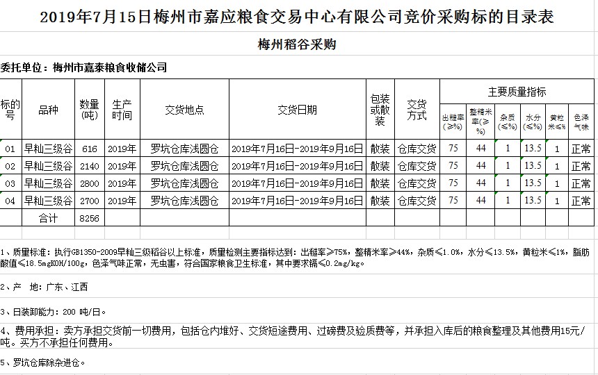 受客戶委托,梅州市嘉應糧食交易中心有限公司定于2019年7月15日(星期一)舉辦糧食競價交易會,梅州市嘉泰糧食收儲公司擬采購2019年早秈稻8256噸。