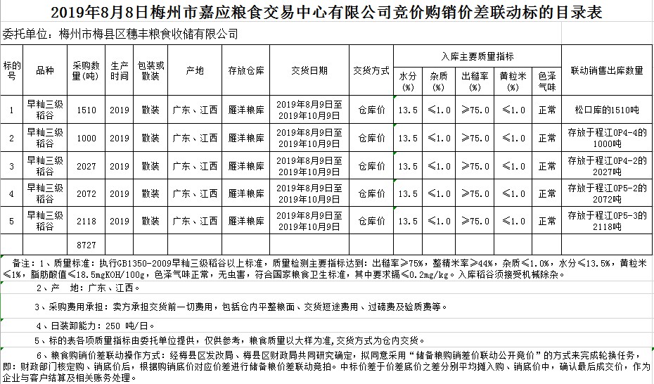 受客戶委托,梅州市嘉應(yīng)糧食交易中心有限公司定于2019年8月8日(星期四)舉辦稻谷購(gòu)銷價(jià)差聯(lián)動(dòng)標(biāo)的交易會(huì),梅州市梅縣區(qū)穗豐糧食收儲(chǔ)有限公司擬銷售和采購(gòu)早秈稻8727噸。
