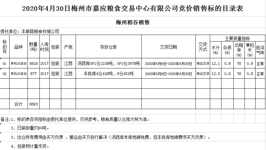 受客戶委托,梅州市嘉應(yīng)糧食交易中心有限公司定于2020年4月30日(星期四)舉辦糧食競(jìng)價(jià)交易會(huì),豐順縣糧食收儲(chǔ)公司擬銷售2017年早秈稻6693噸。