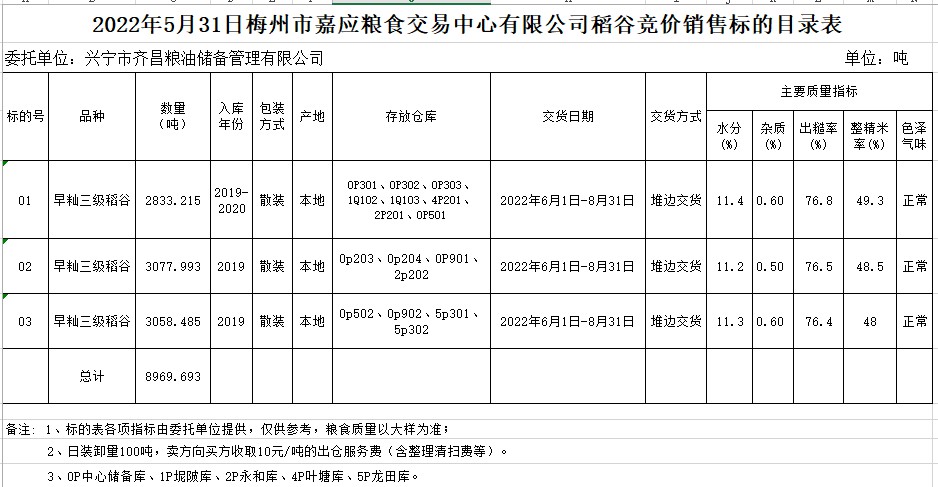 受客戶委托,梅州市嘉應糧食交易中心有限公司定于2022年5月31日(星期二)舉辦糧食競價交易會。興寧市齊昌糧油儲備管理有限公司擬銷售2019、2020年早秈稻8969.693噸。