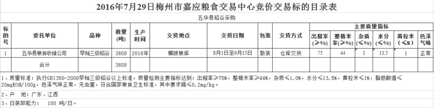 受客戶委托,梅州市嘉應(yīng)糧食交易中心有限公司定于2016年7月29日舉辦糧食競(jìng)價(jià)交易會(huì),廣東省五華縣糧食收儲(chǔ)公司擬采購(gòu)2016年產(chǎn)早秈三級(jí)稻谷3809噸。