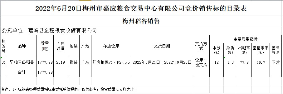 受客戶委托,梅州市嘉應(yīng)糧食交易中心有限公司定于2022年6月20日(星期一)舉辦糧食競(jìng)價(jià)交易會(huì)。蕉嶺縣金穗糧食收儲(chǔ)有限公司擬銷(xiāo)售2019年早秈稻1777.98噸。