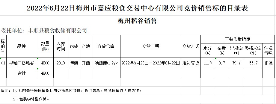 受客戶委托,梅州市嘉應(yīng)糧食交易中心有限公司定于2022年6月22日(星期三)舉辦糧食競價交易會。豐順縣糧食收儲有限公司擬銷售2019年早秈稻4800噸。