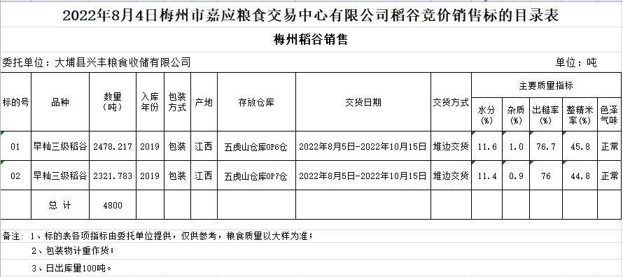 受客戶委托,梅州市嘉應糧食交易中心有限公司定于2022年8月4日(星期四)舉辦糧食競價交易會。大埔縣興豐糧食收儲有限公司擬銷售2019年早秈稻4800噸。