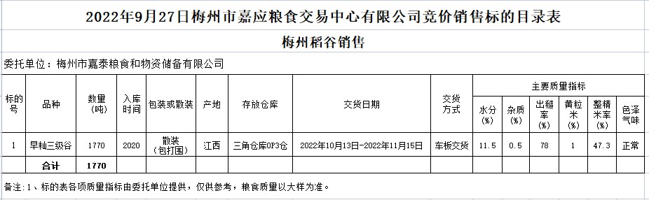 受客戶委托,梅州市嘉應(yīng)糧食交易中心有限公司定于2022年9月27日(星期二)舉辦糧食競(jìng)價(jià)交易會(huì)。梅州市嘉泰糧食和物資儲(chǔ)備有限公司擬銷(xiāo)售2020年早秈稻1770噸。
