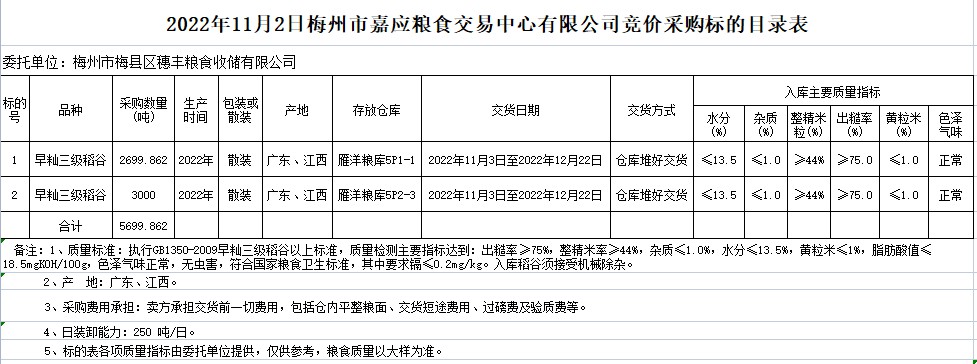 受客戶委托,梅州市嘉應(yīng)糧食交易中心有限公司定于2022年11月2日(星期三)舉辦糧食競(jìng)價(jià)交易會(huì)。梅州市梅縣區(qū)穗豐糧食收儲(chǔ)有限公司擬采購(gòu)2022年早秈稻5699.862噸。