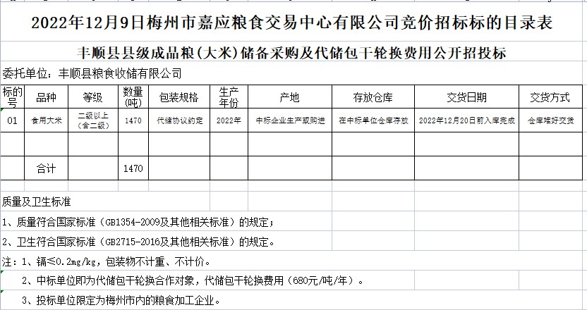 受客戶委托,梅州市嘉應(yīng)糧食交易中心有限公司定于2022年12月9日(星期五)上午10時在廣東省梅州市彬芳大道南161號梅州市糧食交易中心3樓,舉辦豐順縣縣級動態(tài)儲備成品糧(食用大米)采購公開招標。