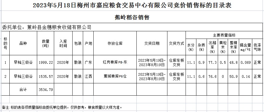 受客戶(hù)委托,梅州市嘉應(yīng)糧食交易中心有限公司定于2023年5月18日(星期四)舉辦糧食競(jìng)價(jià)交易會(huì)。蕉嶺縣金穗糧食收儲(chǔ)有限公司擬銷(xiāo)售2020年早秈稻3534.79噸。