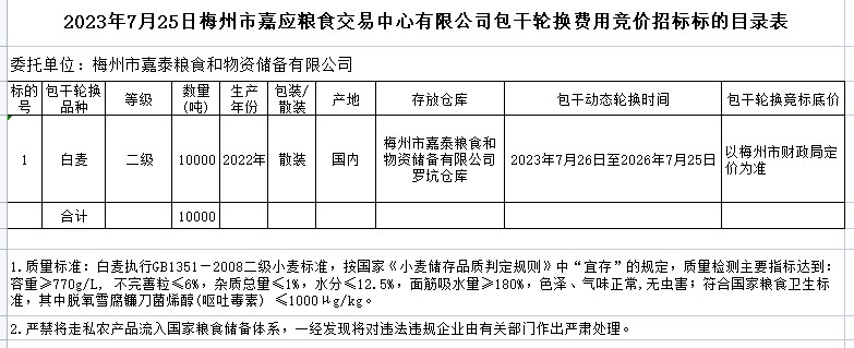 二級小麥10000噸,總價款32577858.44元。包干輪換期限為3年,即從2023年7月26日至2026年7月25日。