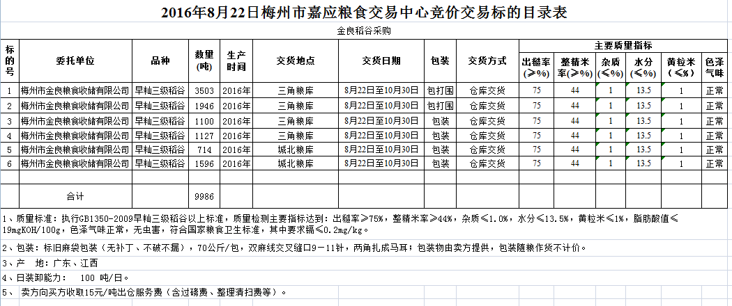 受客戶委托,梅州市嘉應(yīng)糧食交易中心有限公司定于2016年8月22日舉辦糧食競(jìng)價(jià)交易會(huì),梅州市金良糧食收儲(chǔ)有限公司擬采購2016年產(chǎn)早秈三級(jí)稻谷9986噸。