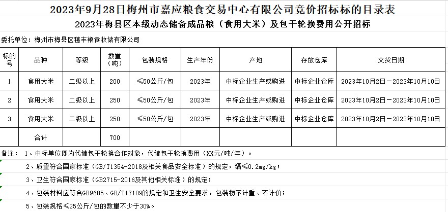 梅縣區(qū)2023年本級(jí)動(dòng)態(tài)儲(chǔ)備成品糧采購(gòu)及包干輪換費(fèi)用公開(kāi)招投標(biāo)公告