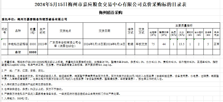 受客戶(hù)委托,梅州市嘉應(yīng)糧食交易中心有限公司定于2024年5月15日(星期三)舉辦糧食競(jìng)價(jià)交易會(huì)。梅州市嘉泰糧食和物資儲(chǔ)備有限公司擬采購(gòu)2023年產(chǎn)中晚秈稻谷8000噸。