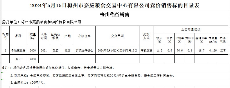 受客戶委托,梅州市嘉應(yīng)糧食交易中心有限公司定于2024年5月15日(星期三)舉辦糧食競價(jià)交易會。梅州市嘉泰糧食和物資儲備有限公司擬銷售2021年產(chǎn)早秈稻2000噸。