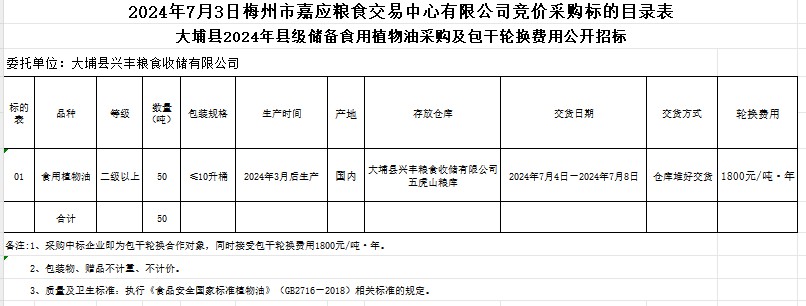 大埔縣2024年縣級儲備食用植物油采購及包干輪換費(fèi)用公開招標(biāo)公告