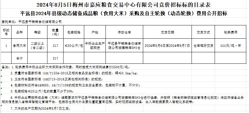 受客戶委托,梅州市嘉應(yīng)糧食交易中心有限公司定于2024年8月5日(星期一)上午10時在廣東省梅州市彬芳大道南161號梅州市糧食交易中心3樓,舉辦平遠(yuǎn)縣2024年縣級動態(tài)儲備成品糧(食用大米)采購及自主輪換(動態(tài)輪換)費用公開招標(biāo)。