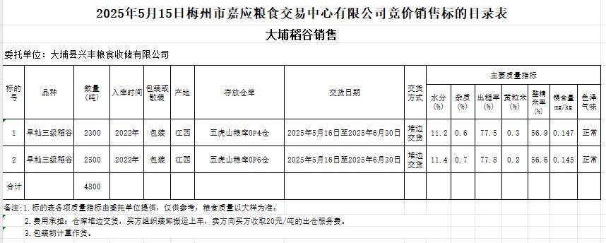 受客戶(hù)委托,梅州市嘉應(yīng)糧食交易中心有限公司定于2025年5月15日(星期四)舉辦糧食競(jìng)價(jià)交易會(huì)。大埔縣興豐糧食收儲(chǔ)有限公司擬銷(xiāo)售2022年產(chǎn)早秈稻谷4800噸。