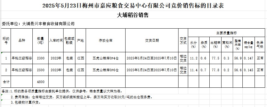 受客戶委托,梅州市嘉應(yīng)糧食交易中心有限公司定于2025年5月23日(星期五)舉辦糧食競價交易會。大埔縣興豐糧食收儲有限公司擬銷售2022年產(chǎn)早秈稻谷4800噸。