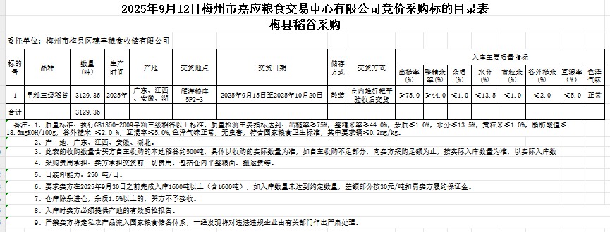 受客戶委托,梅州市嘉應(yīng)糧食交易中心有限公司定于2025年9月12日(星期五)舉辦糧食競價(jià)交易會。梅州市梅縣區(qū)穗豐糧食收儲有限公司擬采購2025年產(chǎn)早秈稻谷3129.36噸。