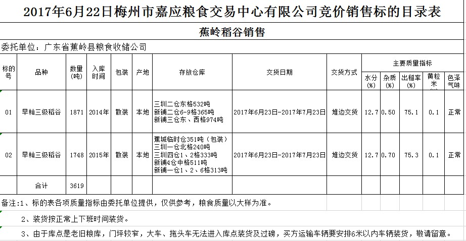 受客戶委托,梅州市嘉應(yīng)糧食交易中心有限公司定于2017年6月22日舉辦糧食競價(jià)交易會,廣東省蕉嶺縣糧食收儲公司擬銷售2014、2015年早秈三級稻谷共3619噸。