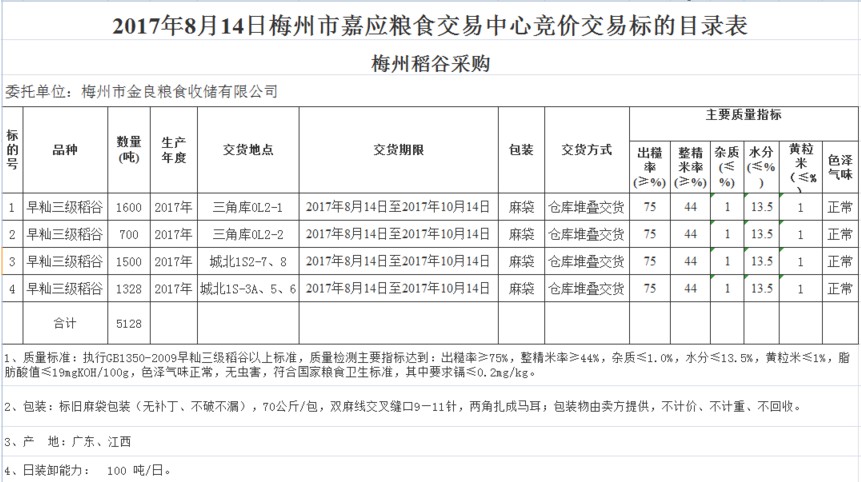 受客戶委托,梅州市嘉應糧食交易中心有限公司定于2017年8月14日舉辦糧食競價交易會,梅州市金良糧食收儲有限公司擬采購2017年早秈三級稻谷共5128噸。