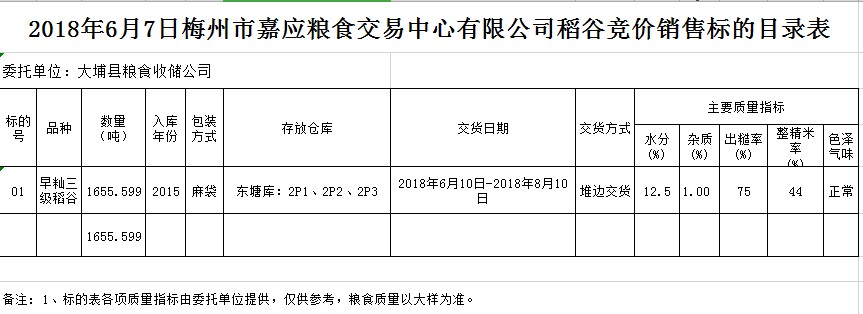 受客戶委托,梅州市嘉應(yīng)糧食交易中心有限公司定于2018年6月7日(星期四)舉辦糧食競價(jià)交易會(huì),大埔縣糧食收儲(chǔ)公司擬銷售早秈稻1655.599噸。