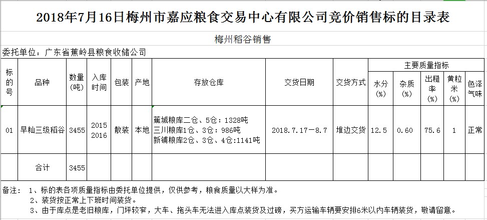 受客戶委托,廣東省蕉嶺縣糧食收儲(chǔ)公司定于2018年7月16日(星期一)舉辦糧食競(jìng)價(jià)交易會(huì),擬銷售早秈稻3455噸。